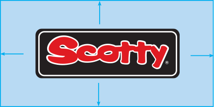 In order for clear representation of the scotty brand, please ensure that there is an adequate amount of white/clear space around all scotty logos (indicated by the light blue and arrows).